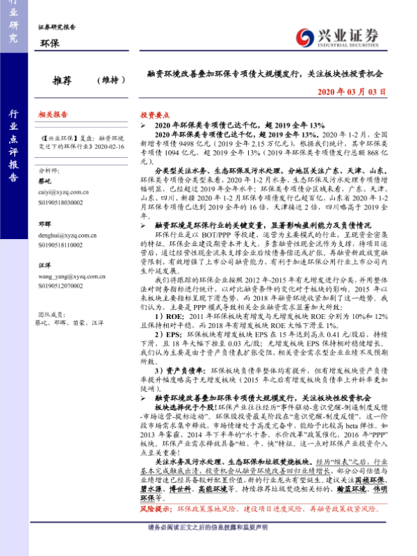 【兴业证券】【20200303】融资环境改善叠加环保专项债大规模发行,关注板块性投资机会-7页