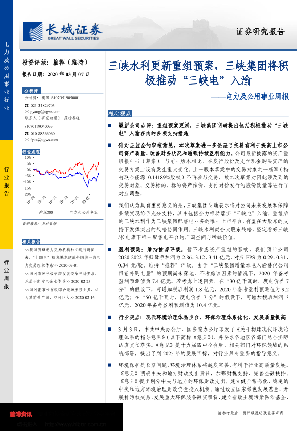 【长城证券】【20200307】电力及公用事业周报:三峡水利更新重组预案,三峡集团将积极推动“三峡电”入渝-12页