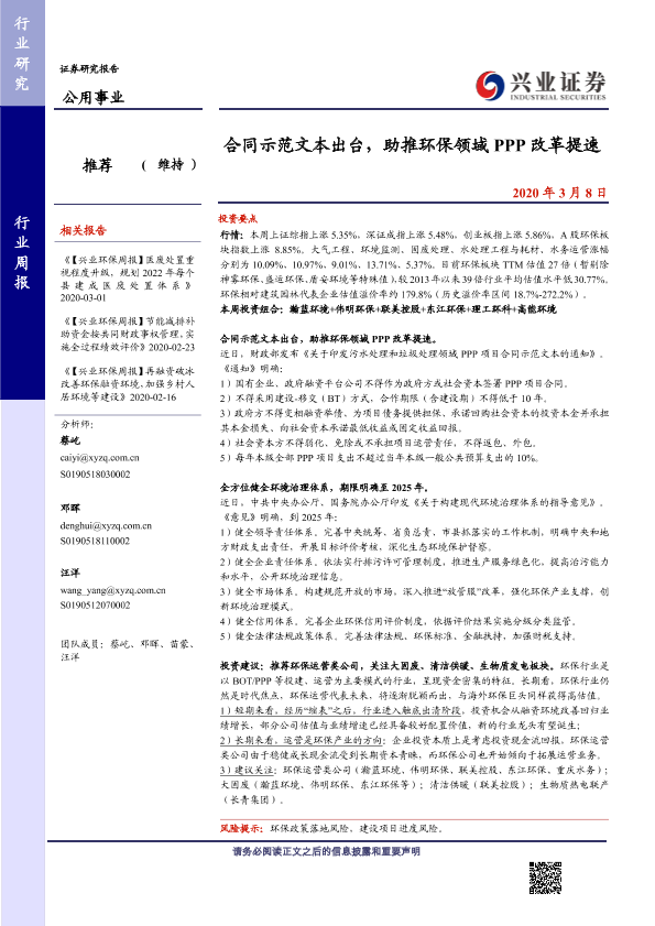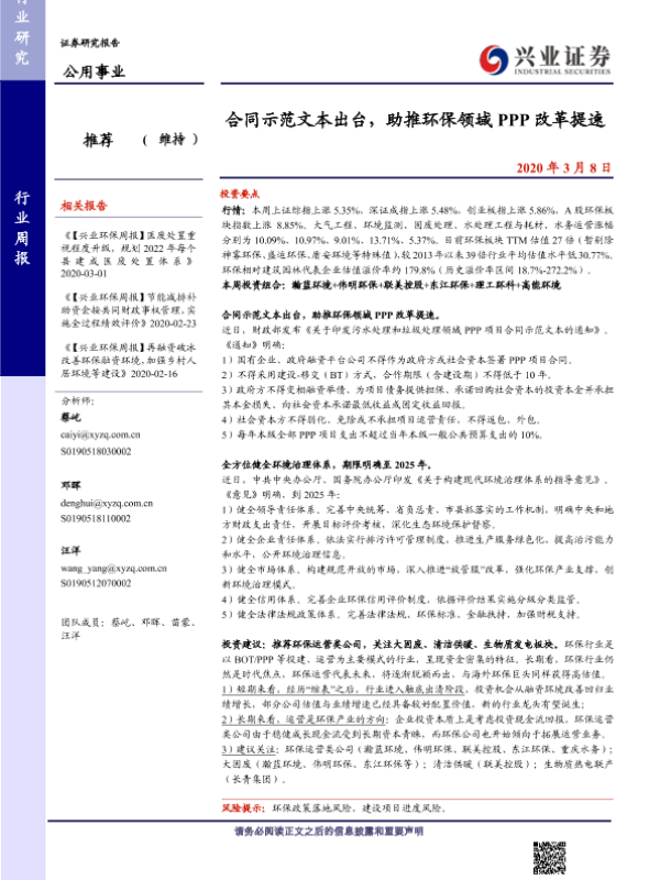 【兴业证券】【20200308】合同示范文本出台,助推环保领域PPP改革提速-10页
