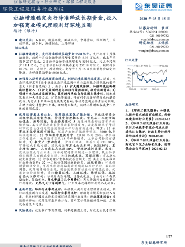 【东吴证券】【20200315】环保工程及服务行业周报:社融增速稳定央行降准释放长期资金,投入加强商业模式理顺利好环境监测-27页
