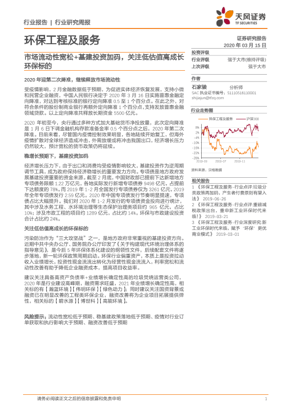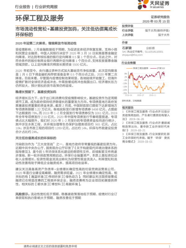 【天风证券】【20200315】环保工程及服务行业研究周报:市场流动性宽松+基建投资加码,关注低估值高成长环保标的-12页
