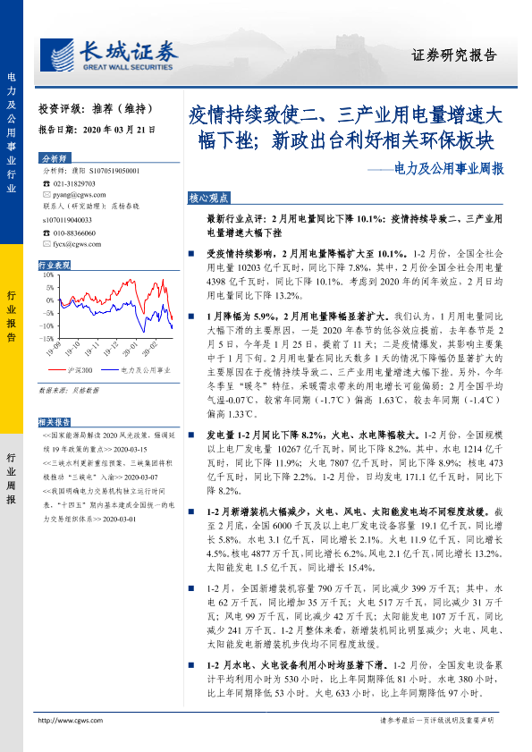 【长城证券】【20200321】电力及公用事业周报:疫情持续致使二、三产业用电量增速大幅下挫;新政出台利好相关环保板块-13页