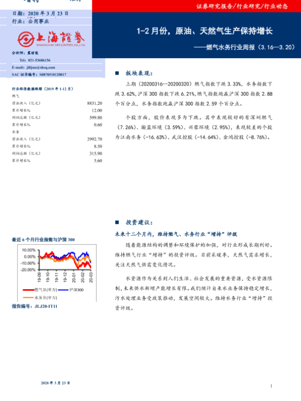 【上海证券】【20200323】燃气水务行业周报:1-2月份,原油、天然气生产保持增长-7页
