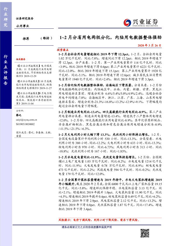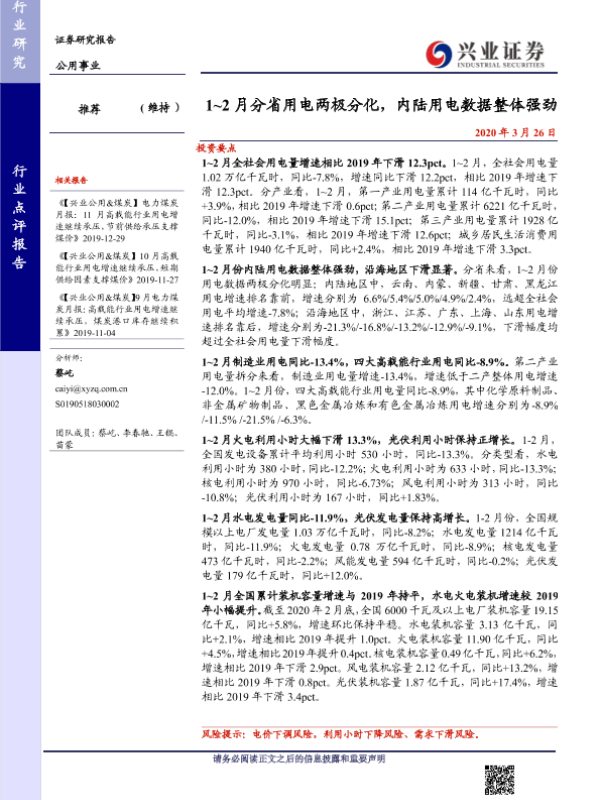 【兴业证券】【20200326】1~2月分省用电两极分化,内陆用电数据整体强劲-12页