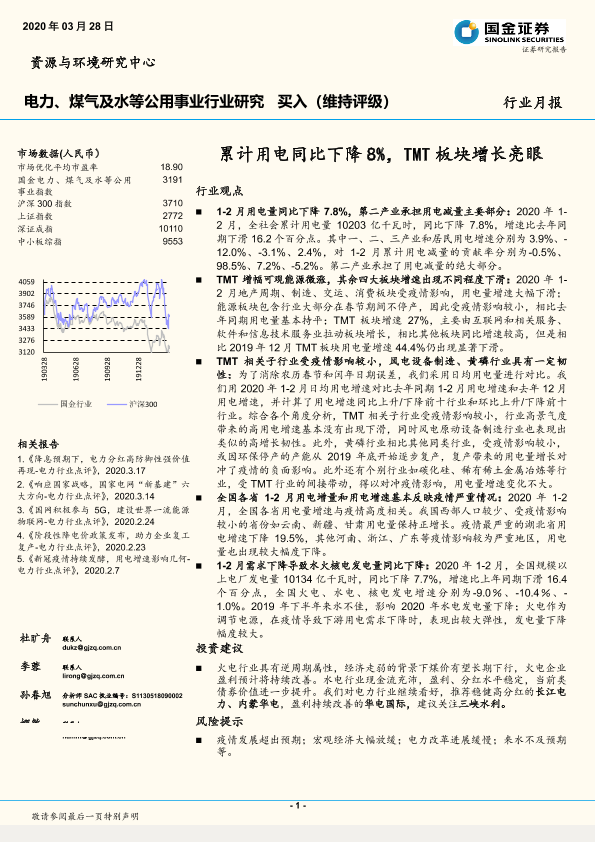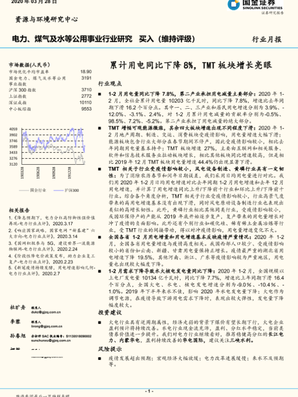【国金证券】【20200328】电力、煤气及水等公用事业行业研究:累计用电同比下降8%,TMT板块增长亮眼-17页