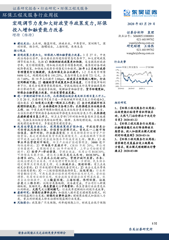 【东吴证券】【20200329】环保工程及服务行业周报:宏观调节力度加大财政货币政策发力,环保投入增加融资能力改善-32页