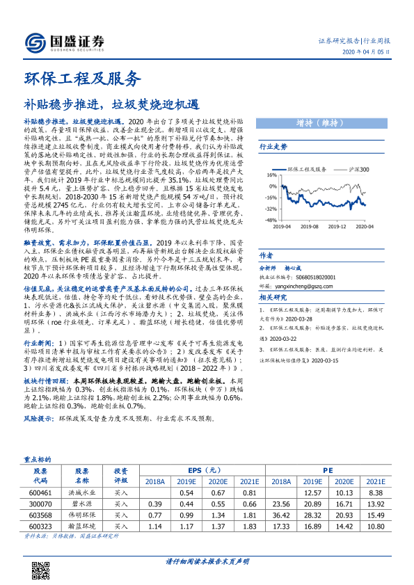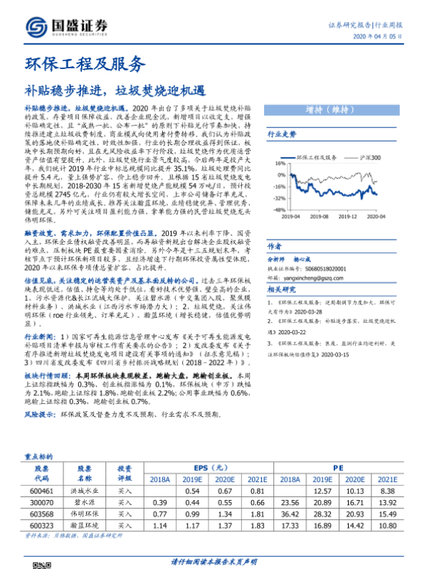 【国盛证券】【20200405】环保工程及服务行业周报:补贴稳步推进,垃圾焚烧迎机遇-16页