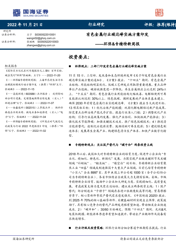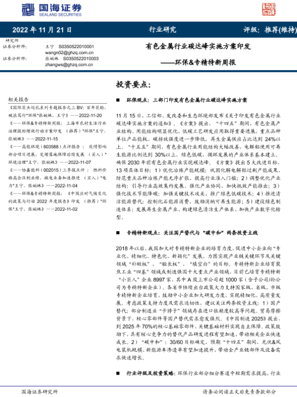 【国海证券】【20221121】环保&专精特新周报:有色金属行业碳达峰实施方案印发-15页