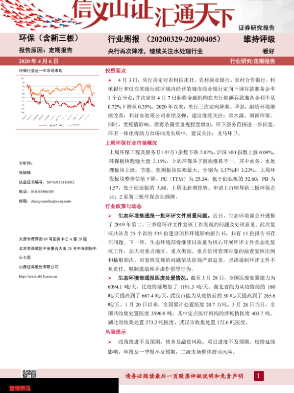 【山西证券】【20200406】环保(含新三板)行业周报:央行再次降准,继续关注水处理行业-12页