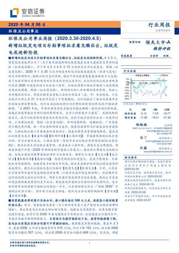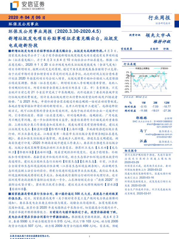 【安信证券】【20200406】环保及公用事业周报:新增垃圾发电项目补贴事项征求意见稿出台,垃圾发电或迎新阶段-18页
