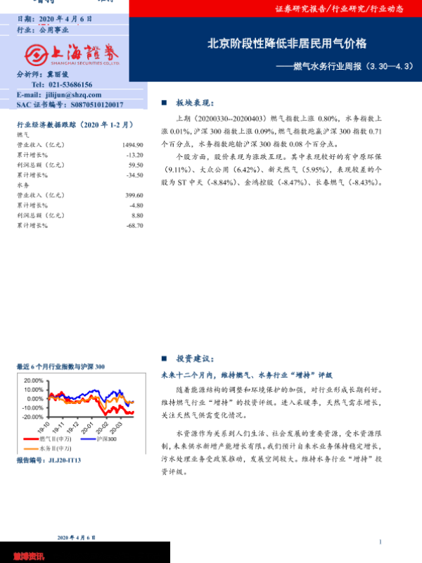 【上海证券】【20200406】燃气水务行业周报:北京阶段性降低非居民用气价格-7页