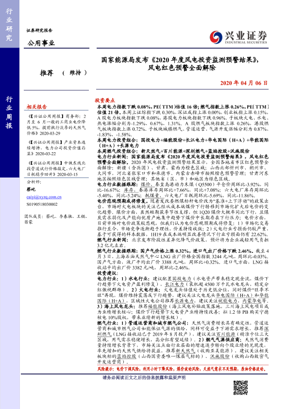 公用事业 红色预警解除 能源局 行业周报 风电投资
