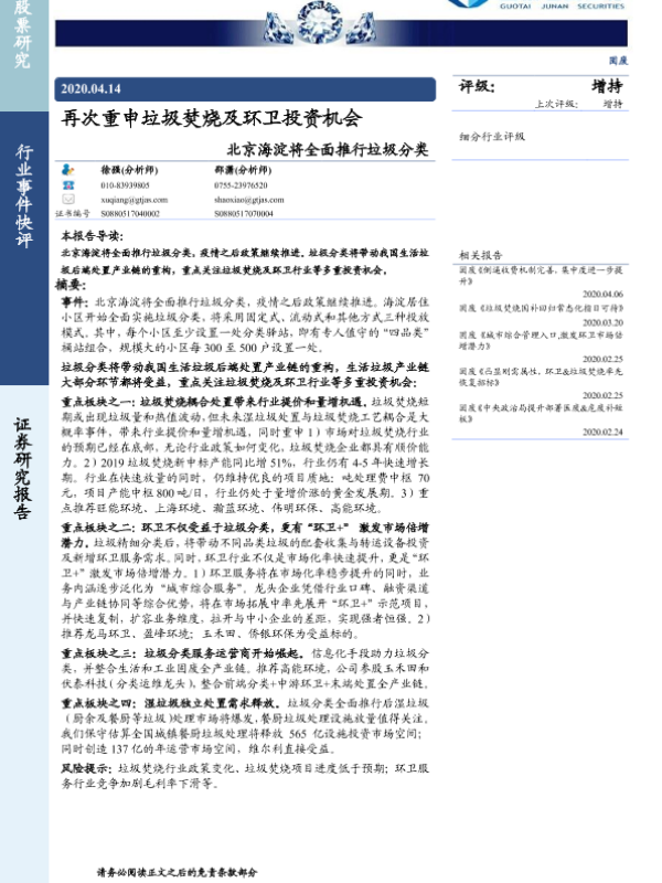 【国泰君安证券】【20200414】北京海淀将全面推行垃圾分类-再次重申垃圾焚烧及环卫投资机会-3页