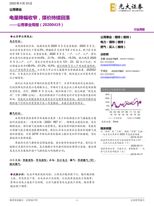 【光大证券】【20200419】公用事业周报:电量降幅收窄,煤价持续回落-9页