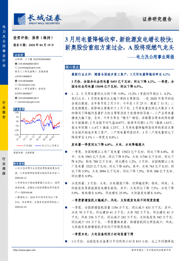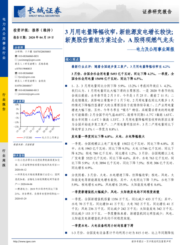 【长城证券】【20200419】3月用电量降幅收窄,新能源发电增长较快;新奥股份重组方案过会,A股将现燃气龙头-12页