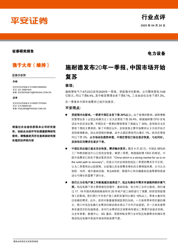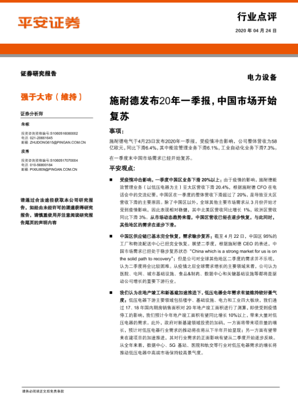 【平安证券】【20200424】电力设备行业点评:施耐德发布20年一季报,中国市场开始复苏-5页