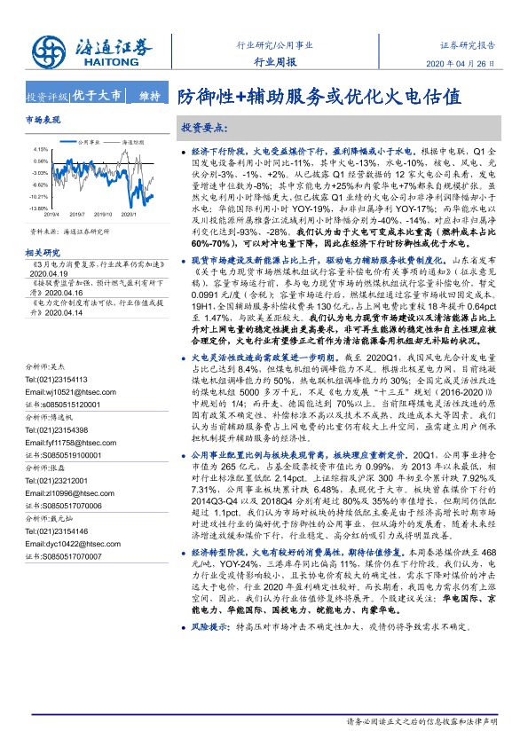 【海通证券】【20200426】公用事业行业周报:防御性+辅助服务或优化火电估值-2页
