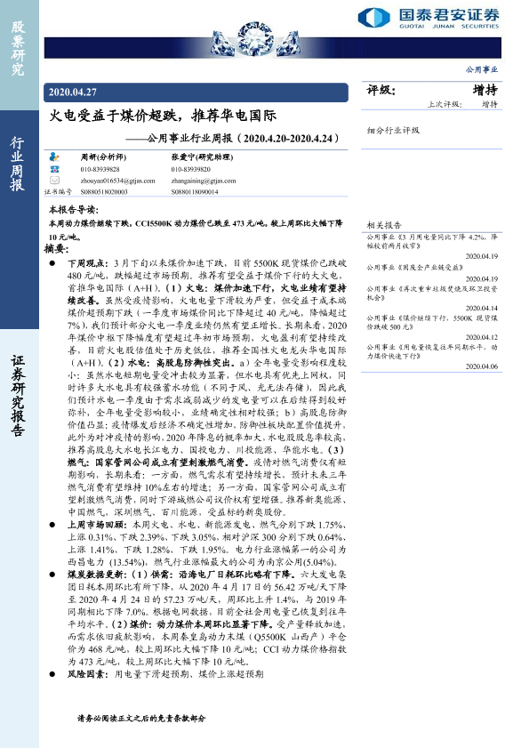 【国泰君安证券】【20200427】火电受益于煤价超跌,推荐华电国际-14页