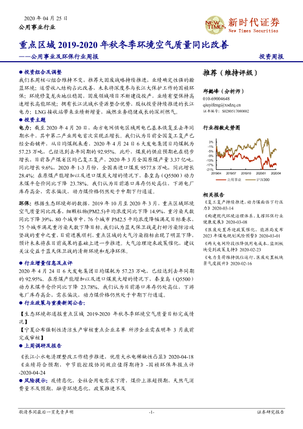 公用事业 动力煤价格 环保行业 空气质量 蓝天保卫战