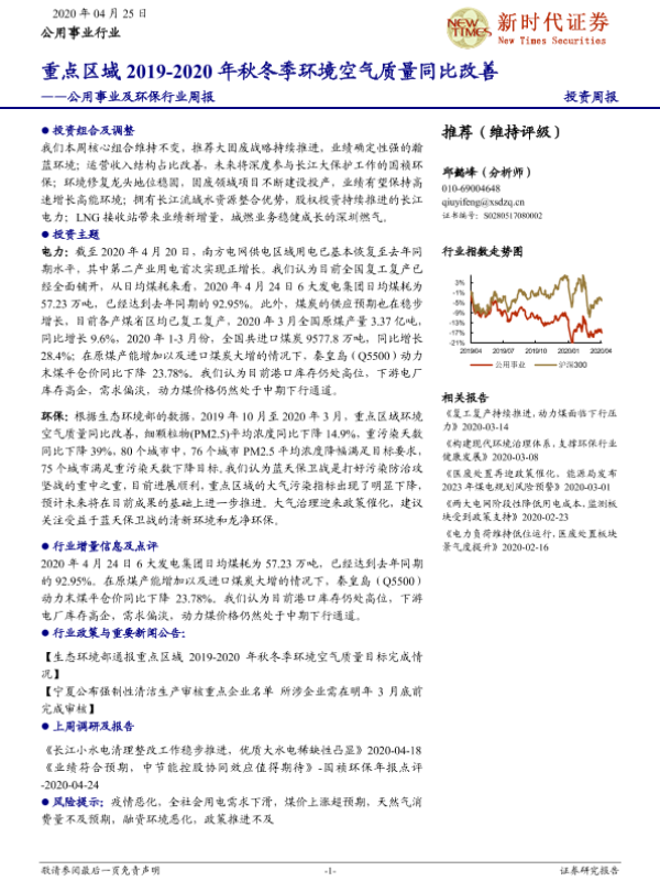 【新时代证券】【20200425】重点区域2019-2020年秋冬季环境空气质量同比改善-18页