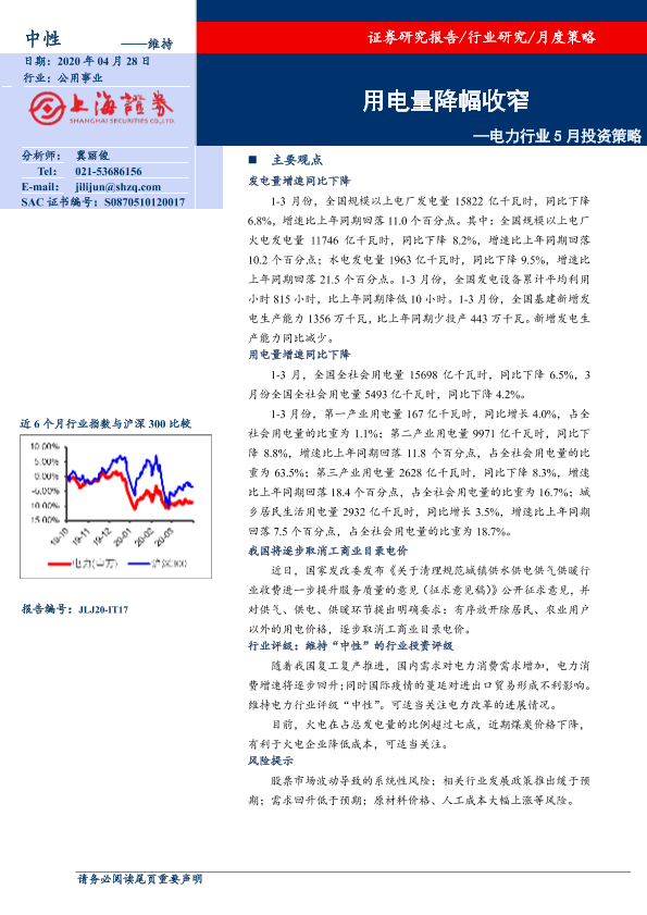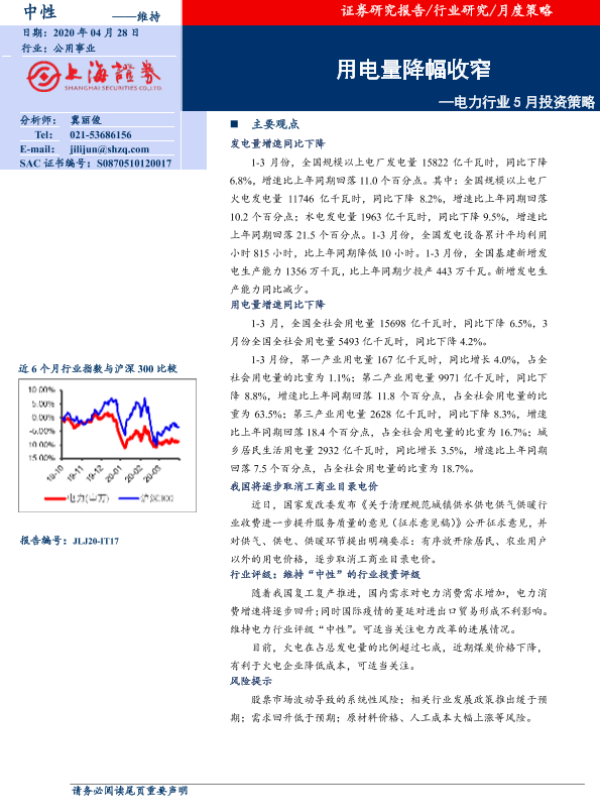 【上海证券】【20200428】电力行业5月投资策略:用电量降幅收窄-11页