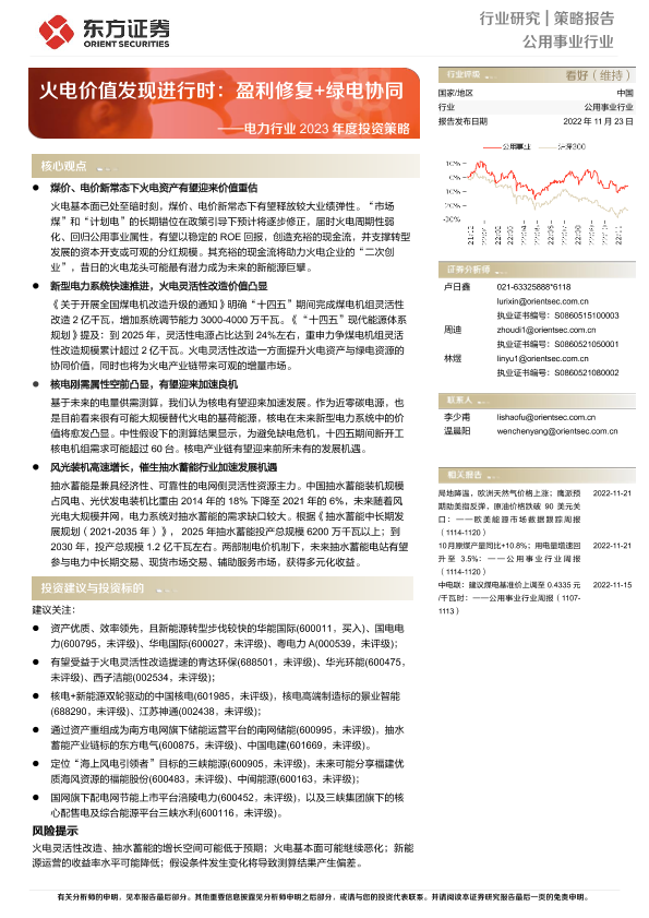 【东方证券】【20221123】电力行业2023年度投资策略:火电价值发现进行时,盈利修复+绿电协同-34页