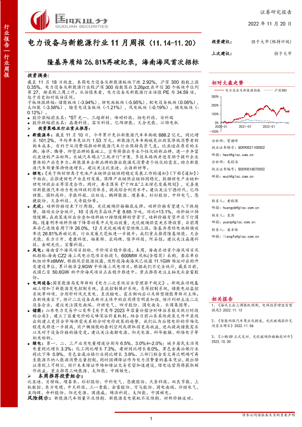 【国联证券】【20221120】电力设备与新能源行业11月周报:隆基异质结26.81%再破纪录,海南海风首次招标-18页