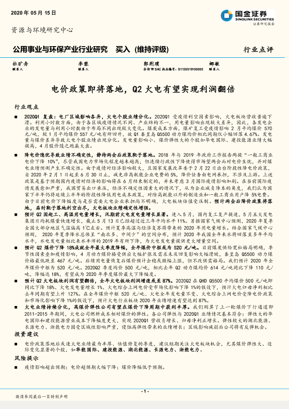 【国金证券】【20200515】公用事业与环保产业行业研究:电价政策即将落地,Q2火电有望实现利润翻倍-4页