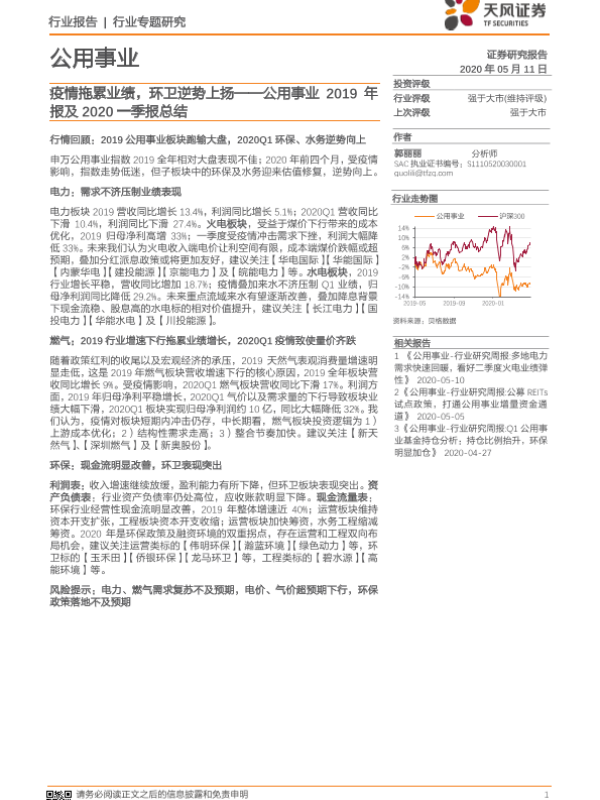 【天风证券】【20200511】疫情拖累业绩,环卫逆势上扬——公用事业2019年报及2020一季报总结-33页