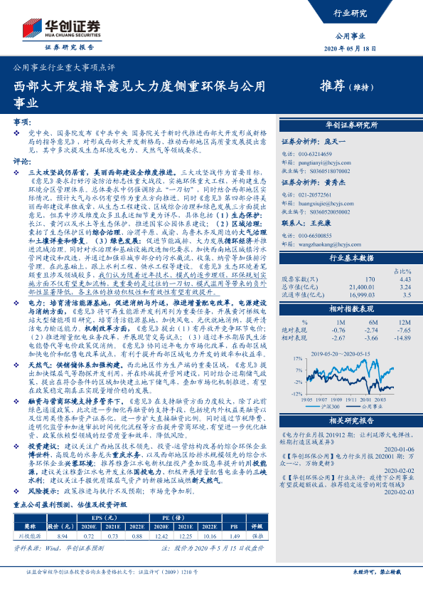 【华创证券】【20200518】公用事业行业重大事项点评:西部大开发指导意见大力度侧重环保与公用事业-3页