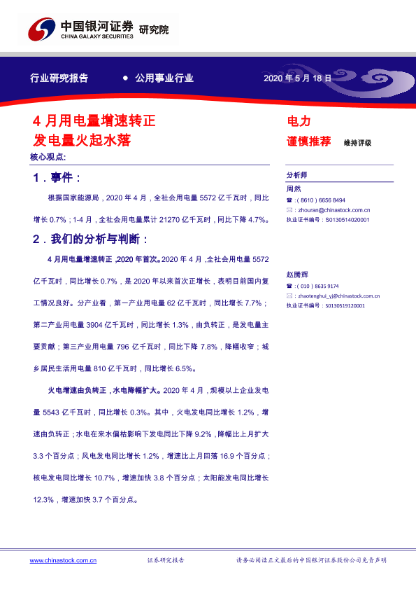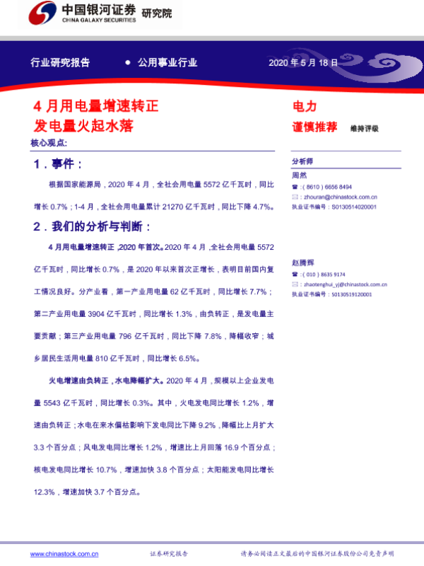 【银河证券】【20200518】4月用电量增速转正 发电量火起水落-6页