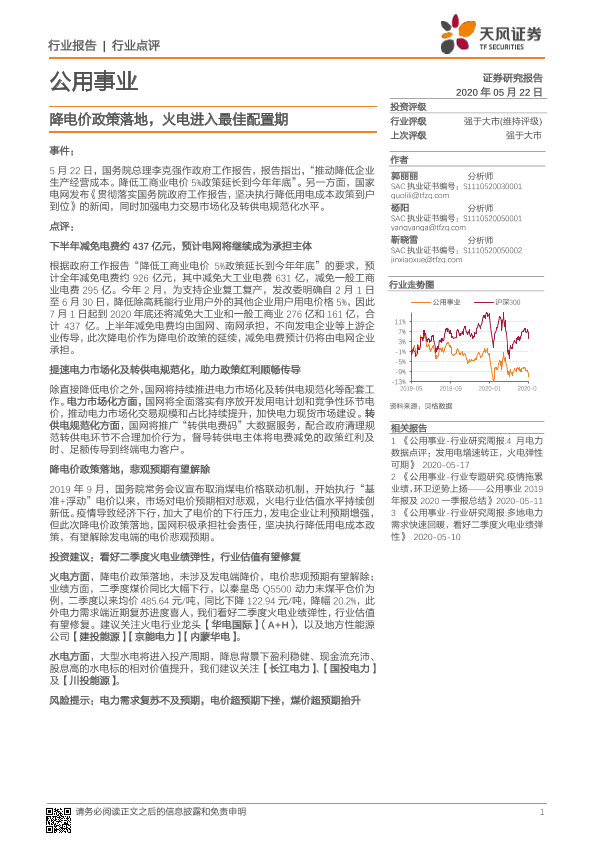 【天风证券】【20200522】公用事业行业点评:降电价政策落地,火电进入最佳配置期-2页