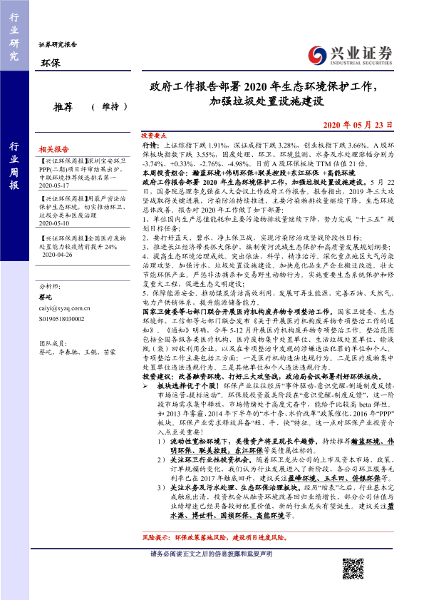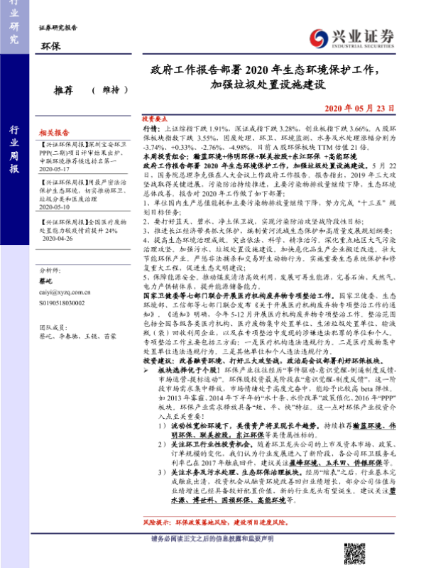 【兴业证券】【20200523】政府工作报告部署2020年生态环境保护工作,加强垃圾处置设施建设-8页