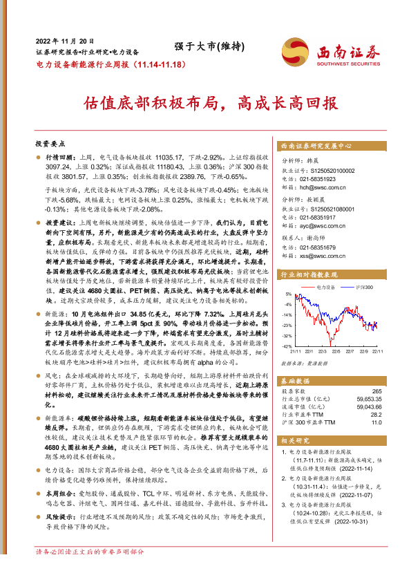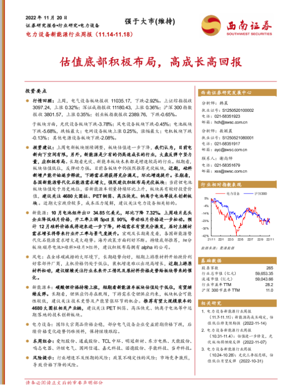 【西南证券】【20221120】电力设备新能源行业周报:估值底部积极布局,高成长高回报-35页