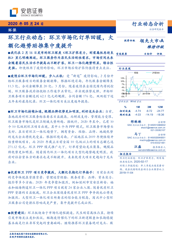 【安信证券】【20200524】环卫行业动态:环卫市场化订单回暖,大额化趋势助推集中度提升-19页