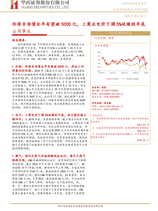 【华西证券】【20200524】公用事业行业研究周报:环保专项债全年有望破5000亿,工商业电价下调5%延续到年底-15页