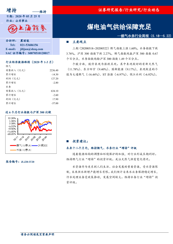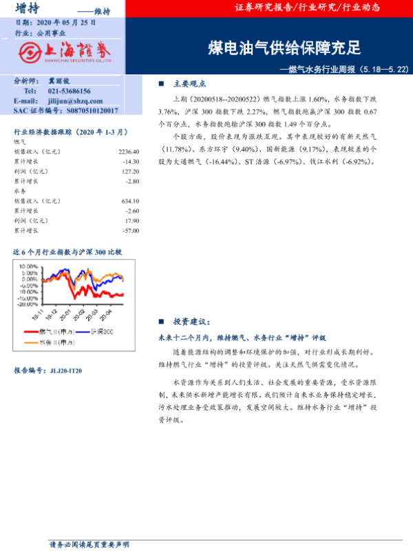 【上海证券】【20200525】燃气水务行业周报:煤电油气供给保障充足-7页