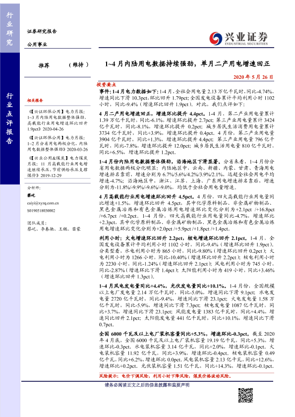 【兴业证券】【20200526】1~4月内陆用电数据持续强劲,单月二产用电增速回正-14页