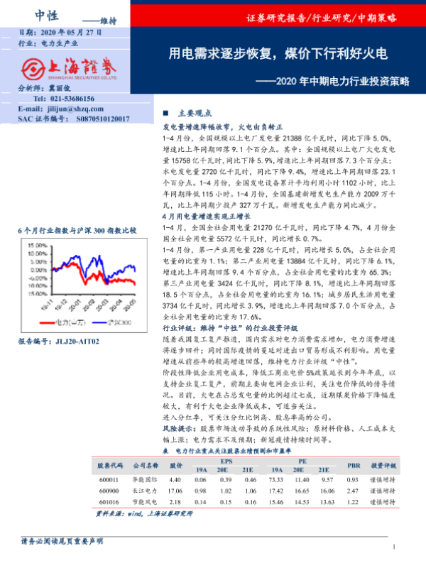 【上海证券】【20200527】2020年中期电力行业投资策略:用电需求逐步恢复,煤价下行利好火电-16页