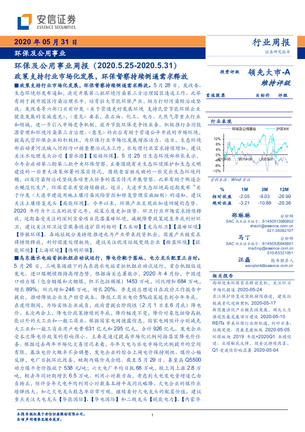 【安信证券】【20200531】环保及公用事业周报:政策支持行业市场化发展,环保督察持续倒逼需求释放-17页