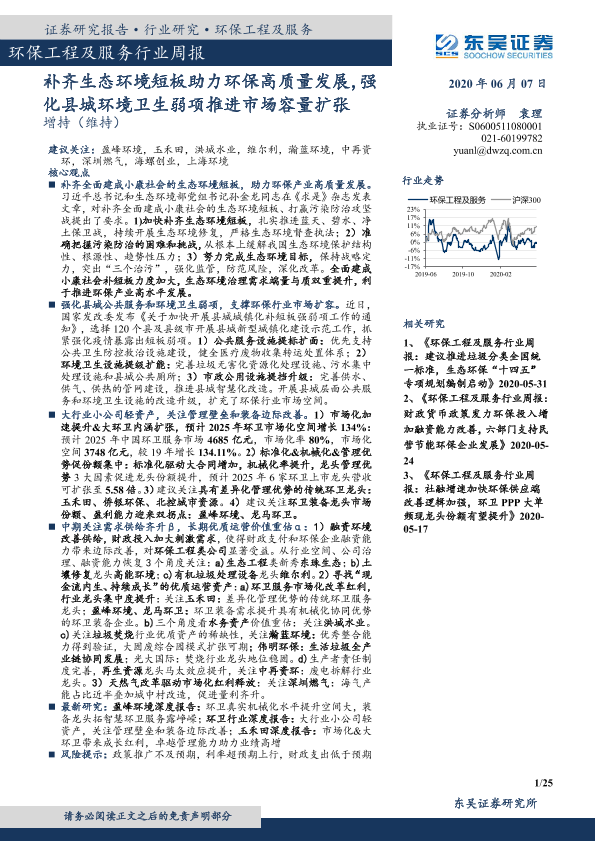 【东吴证券】【20200607】环保工程及服务行业周报:补齐生态环境短板助力环保高质量发展,强化县城环境卫生弱项推进市场容量扩张-25页