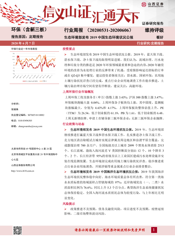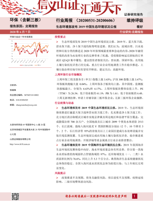 【山西证券】【20200607】环保(含新三板)行业周报:生态环境部发布2019中国生态环境状况公报-12页