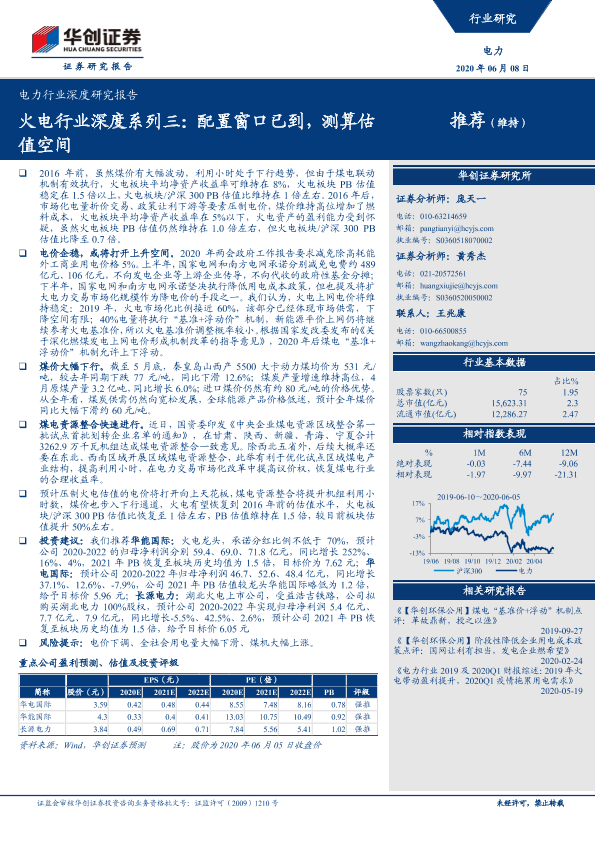 【华创证券】【20200608】电力行业深度研究报告:火电行业深度系列三:配置窗口已到,测算估值空间-15页