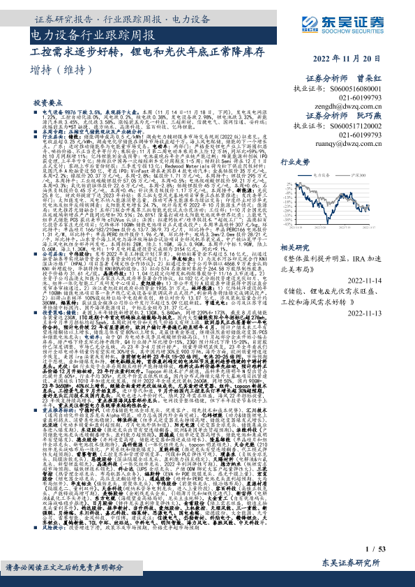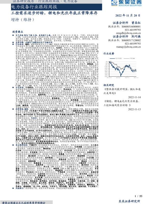 【东吴证券】【20221120】电力设备行业跟踪周报:工控需求逐步好转,锂电和光伏年底正常降库存-53页