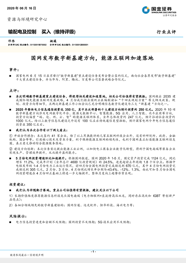 【国金证券】【20200616】输配电及控制:国网发布数字新基建方向,能源互联网加速落地-5页