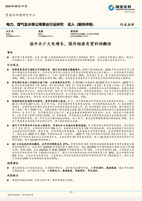 【国金证券】【20200617】电力、煤气及水等公用事业行业研究:温升水少火电增长,煤价短涨有望利润翻倍-5页