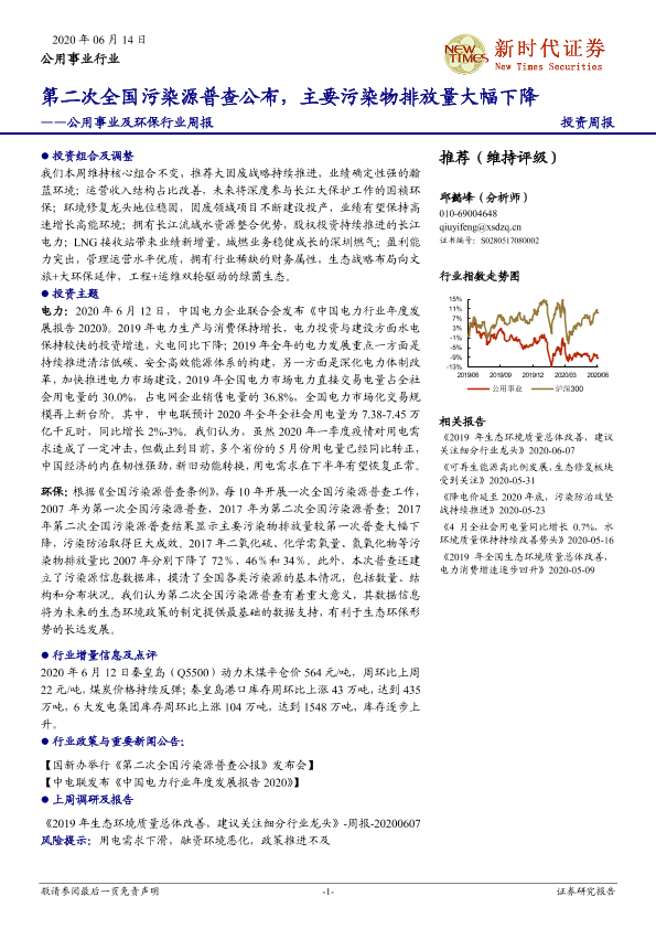 【新时代证券】【20200614】新时代证券-公用事业及环保行业周报:第二次全国污染源普查公布,主要污染物排放量大幅下降-17页