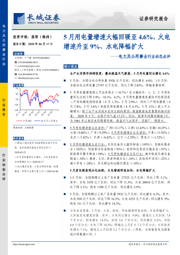 【长城证券】【20200617】5月用电量增速大幅回暖至4.6%,火电增速升至9%、水电降幅扩大-12页