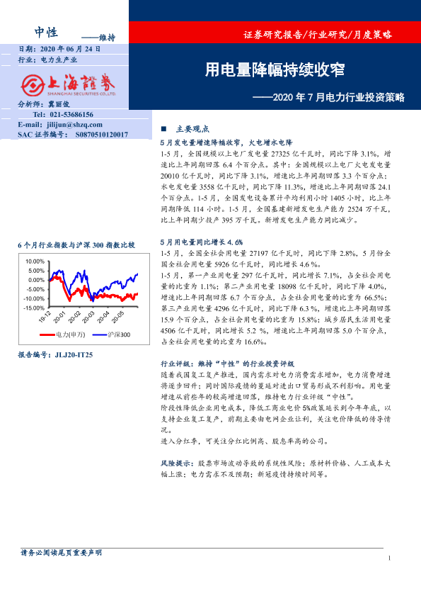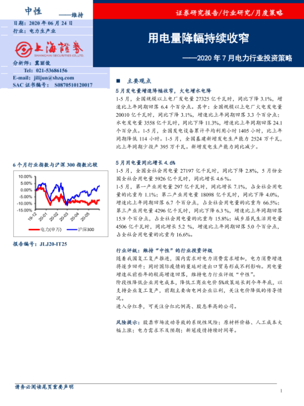 【上海证券】【20200624】2020年7月电力行业投资策略:用电量降幅持续收窄-12页