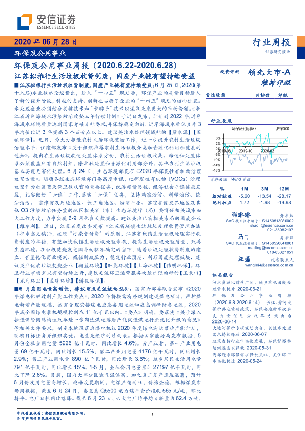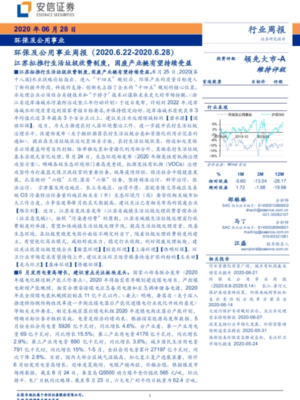 【安信证券】【20200628】环保及公用事业行业周报:江苏拟推行生活垃圾收费制度,固废产业链有望持续受益-17页